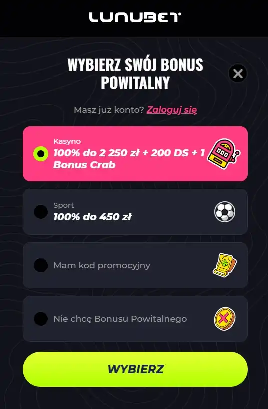Kasyno LunuBet oferuje free spiny w pakiecie powitalnym. Po utworzeniu konta należy wpłacić co najmniej 90 złotych. Kwota ta zostanie następnie podwojona a dopiero po jej rozegraniu zostaniesz nagrodzony dodatkowymi 200 darmowymi spinami. Będą one dodawane do Twojego salda w porcjach - 20 obrotów dziennie i musisz je rozegrać w ciągu 24 godzin od ich otrzymania. Wymóg obrotu dla free spinów z bonusu LunuBet na start - x40.